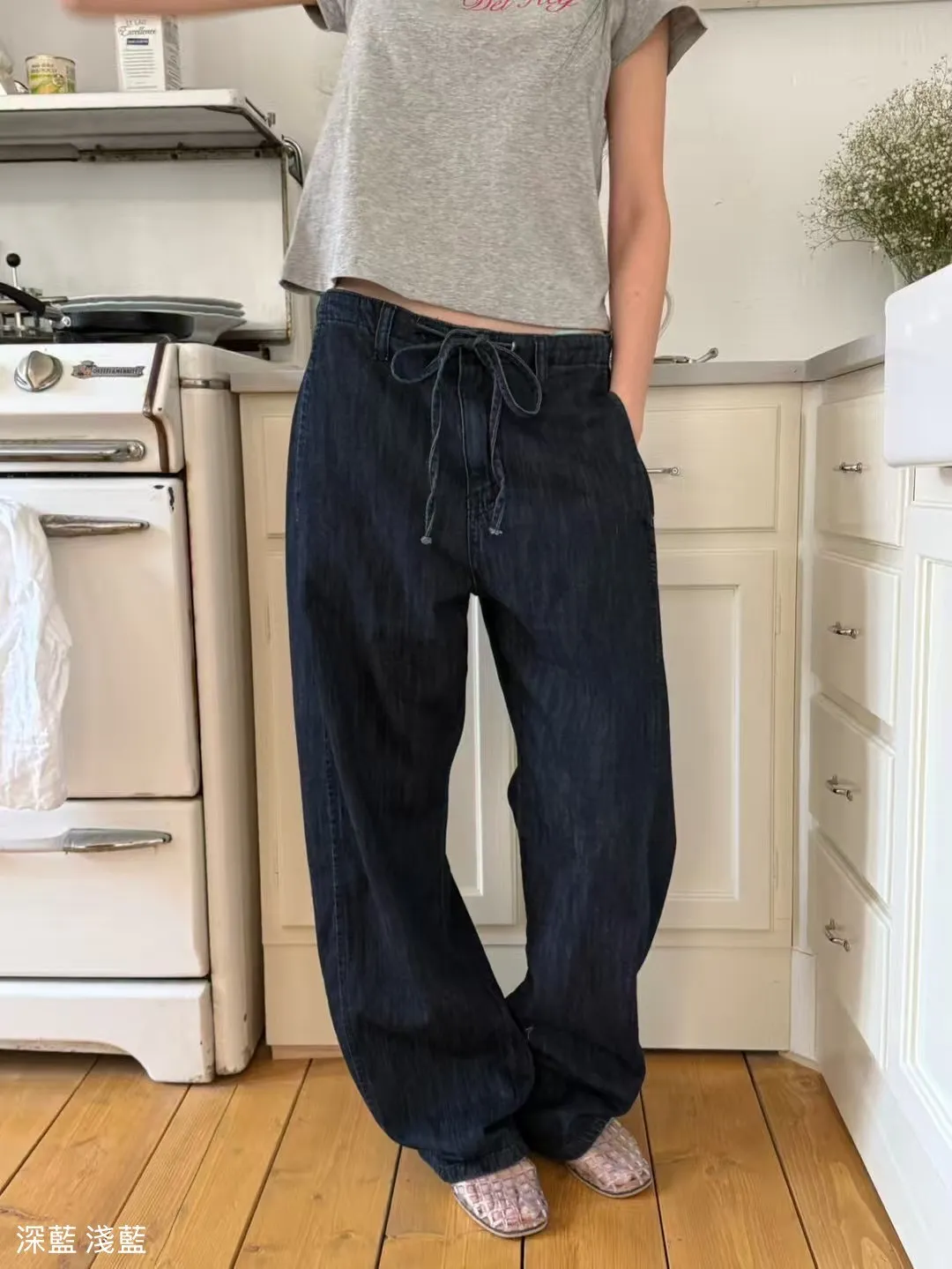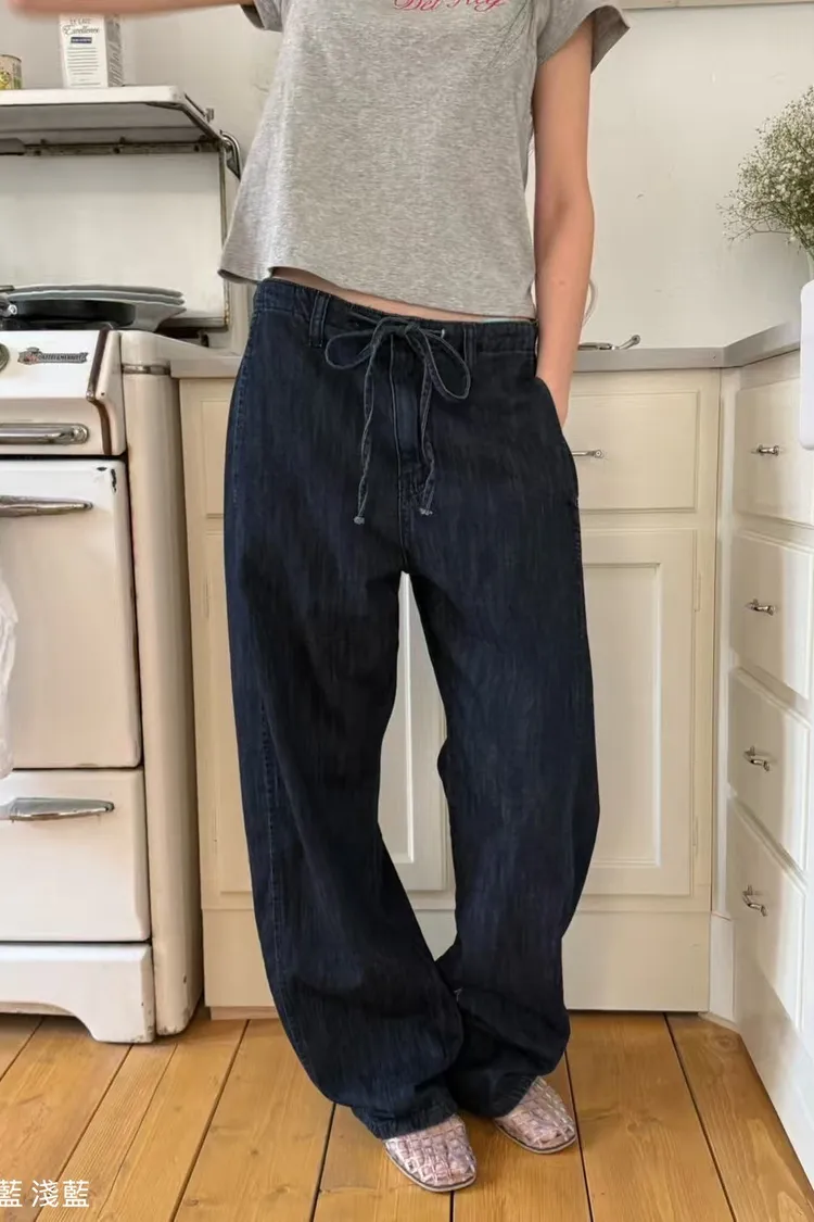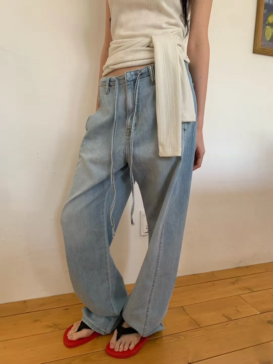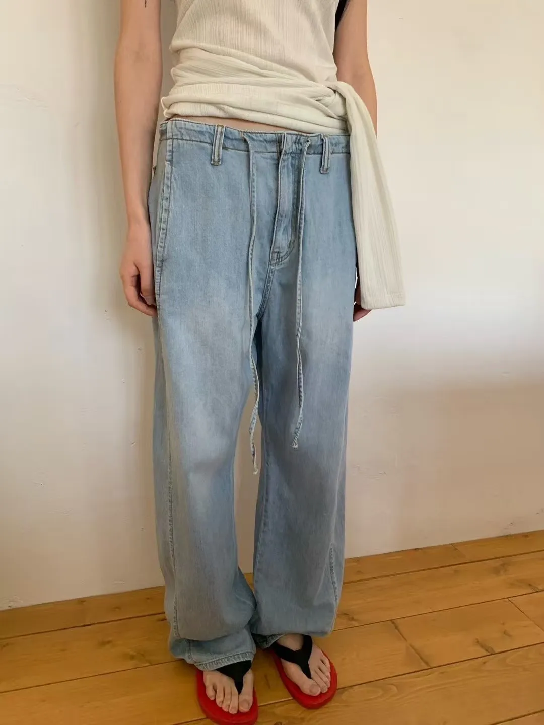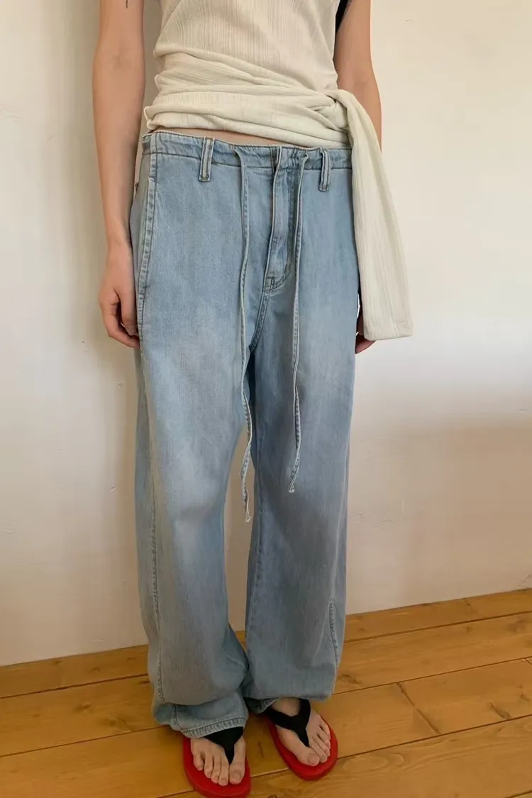 5-6前綁帶薄料落地丹寧褲