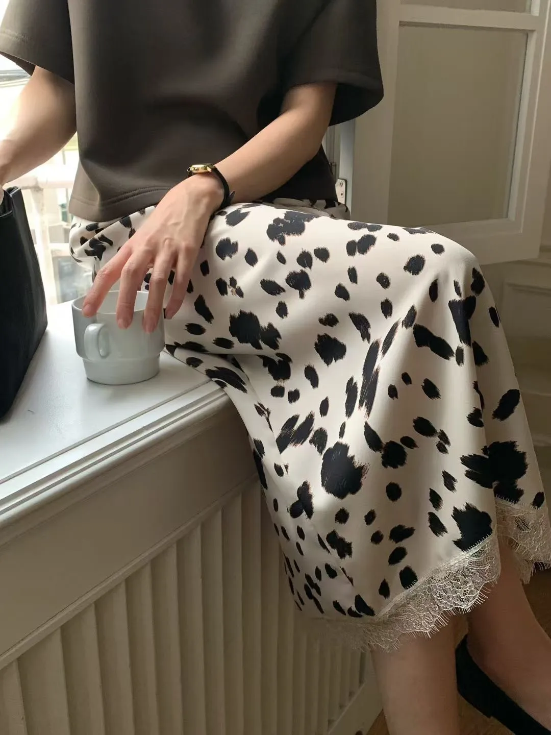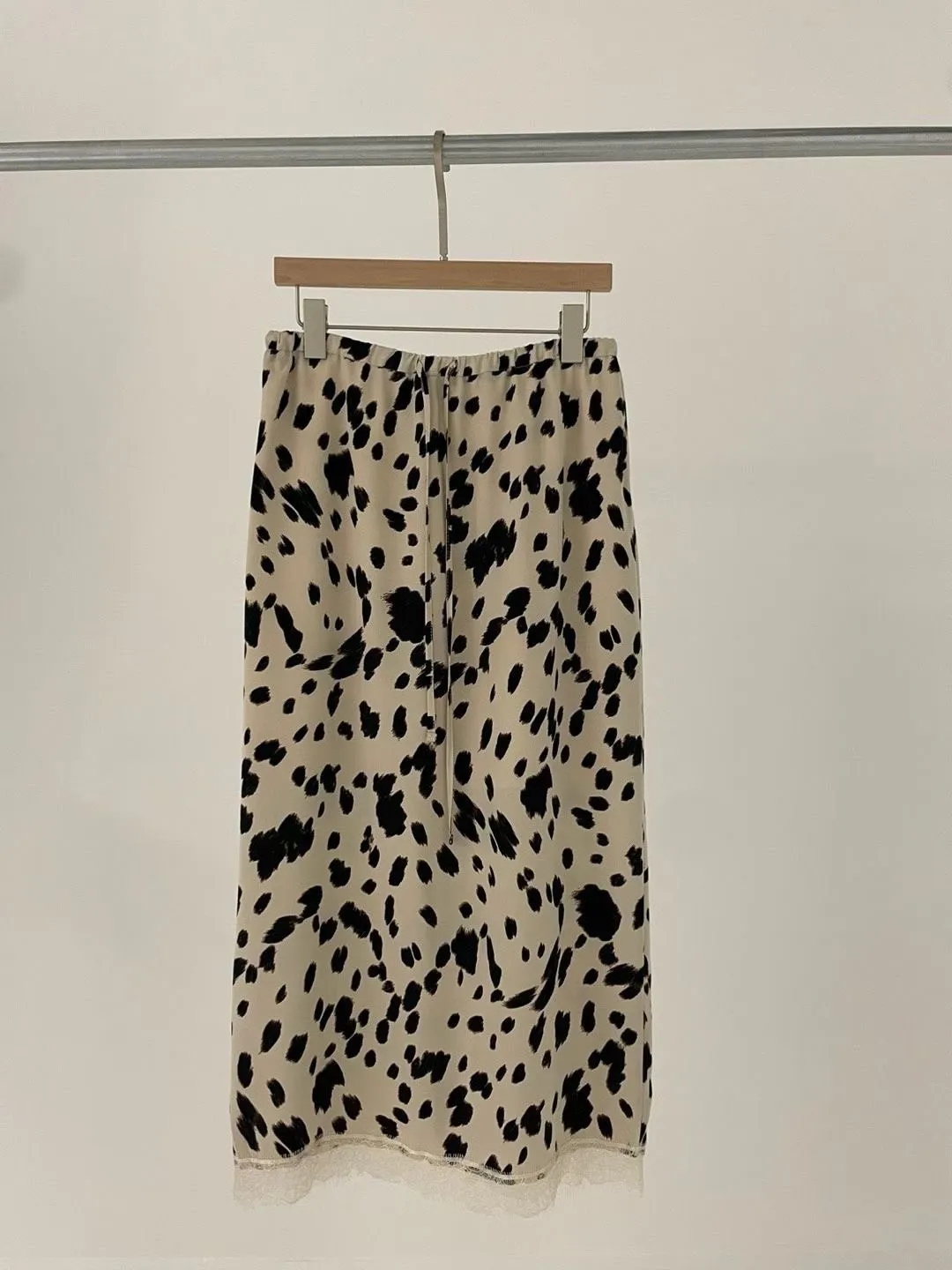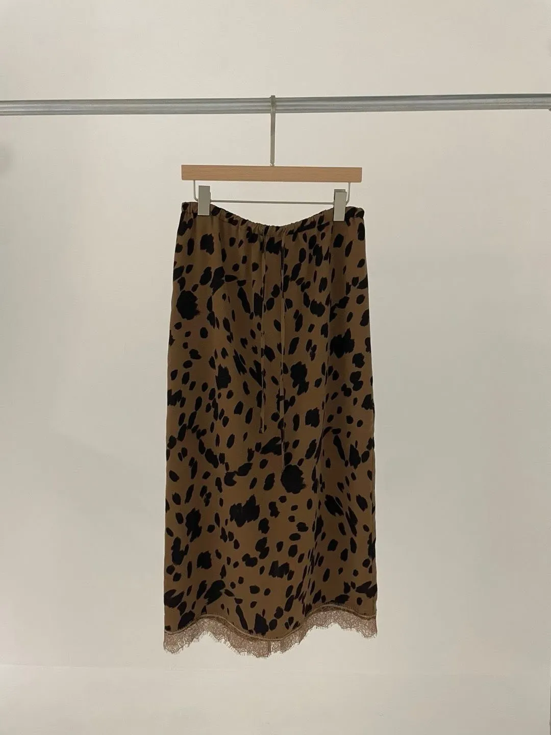 5-9豹紋下擺睫毛蕾絲滑緞八分裙