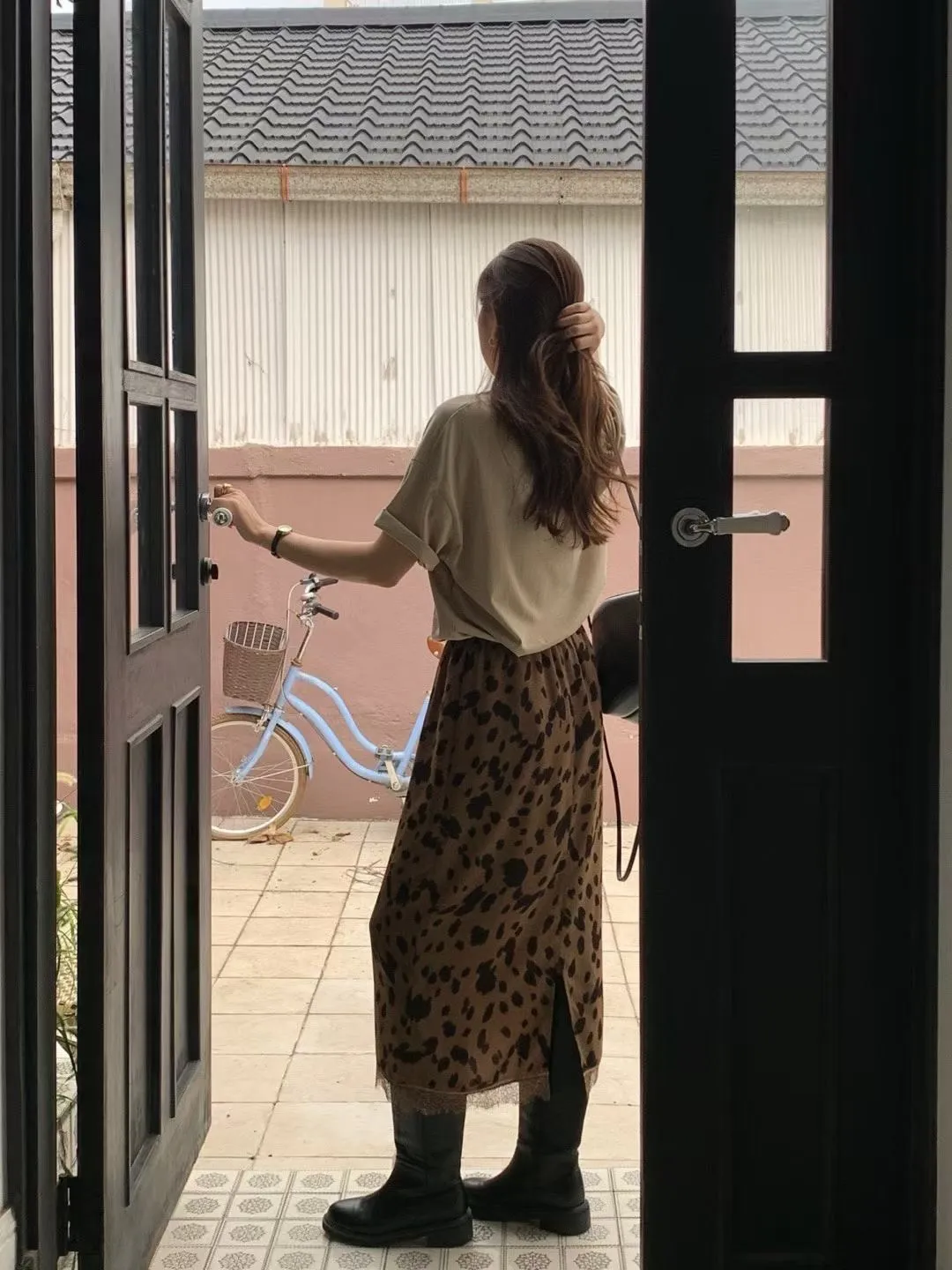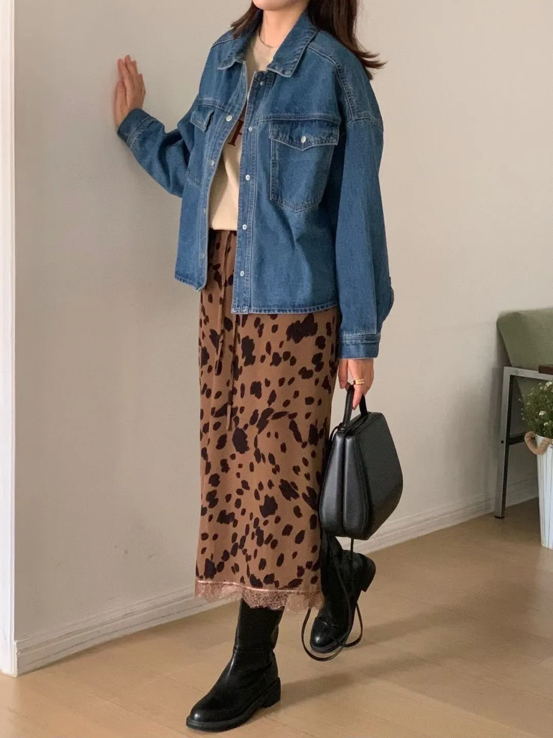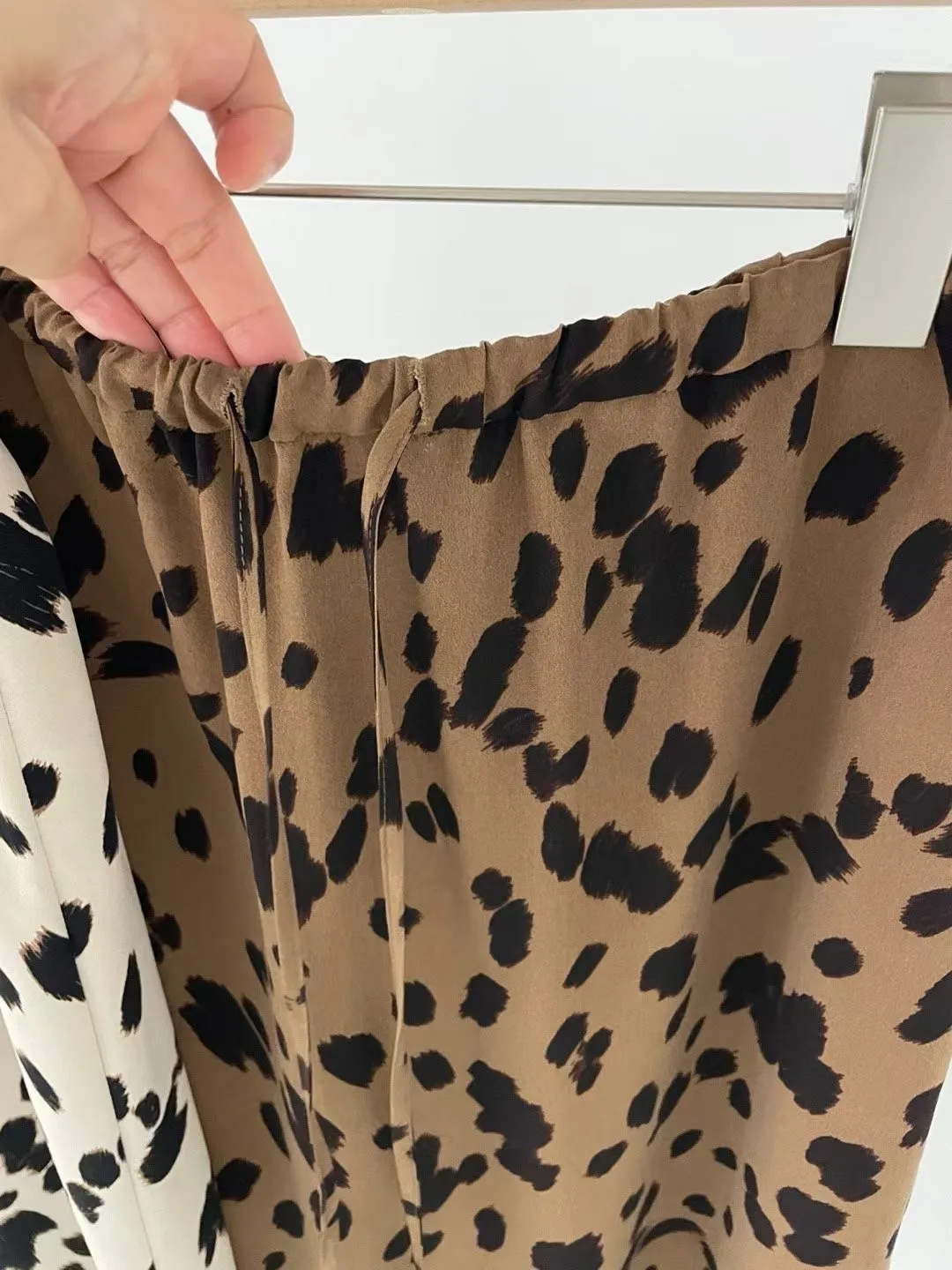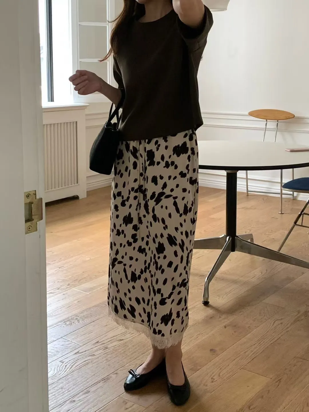 5-9豹紋下擺睫毛蕾絲滑緞八分裙