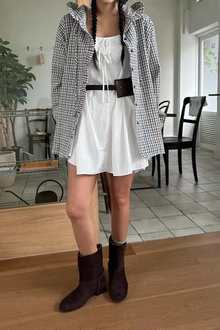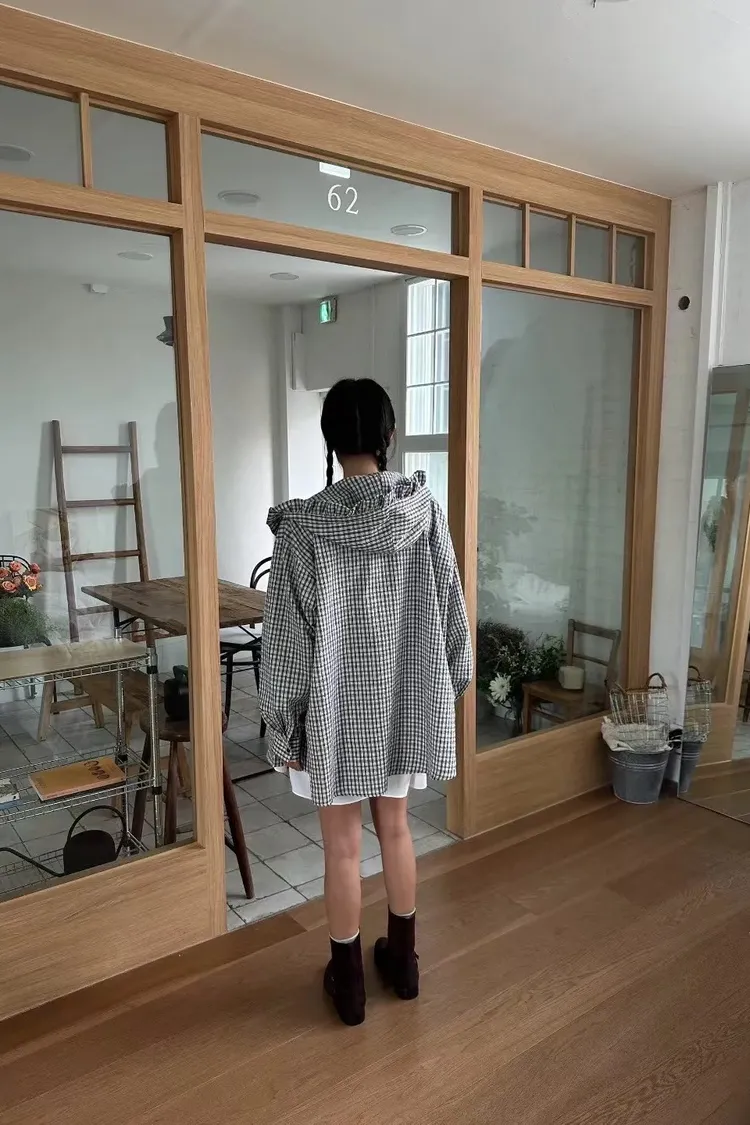 5-9荷葉滾邊設計連帽小格襯衫外罩