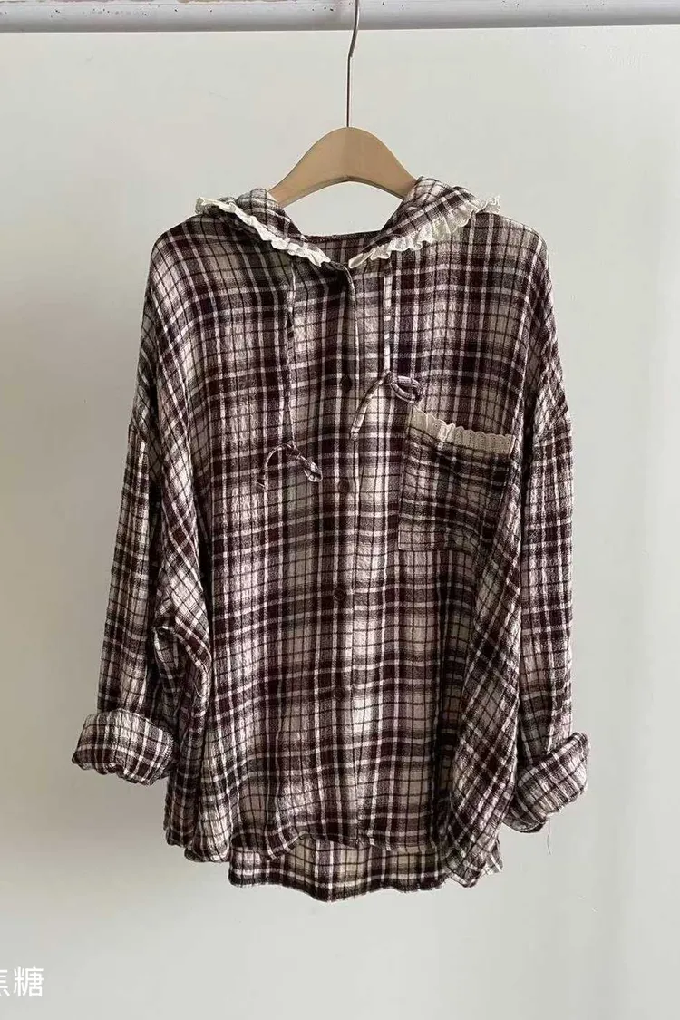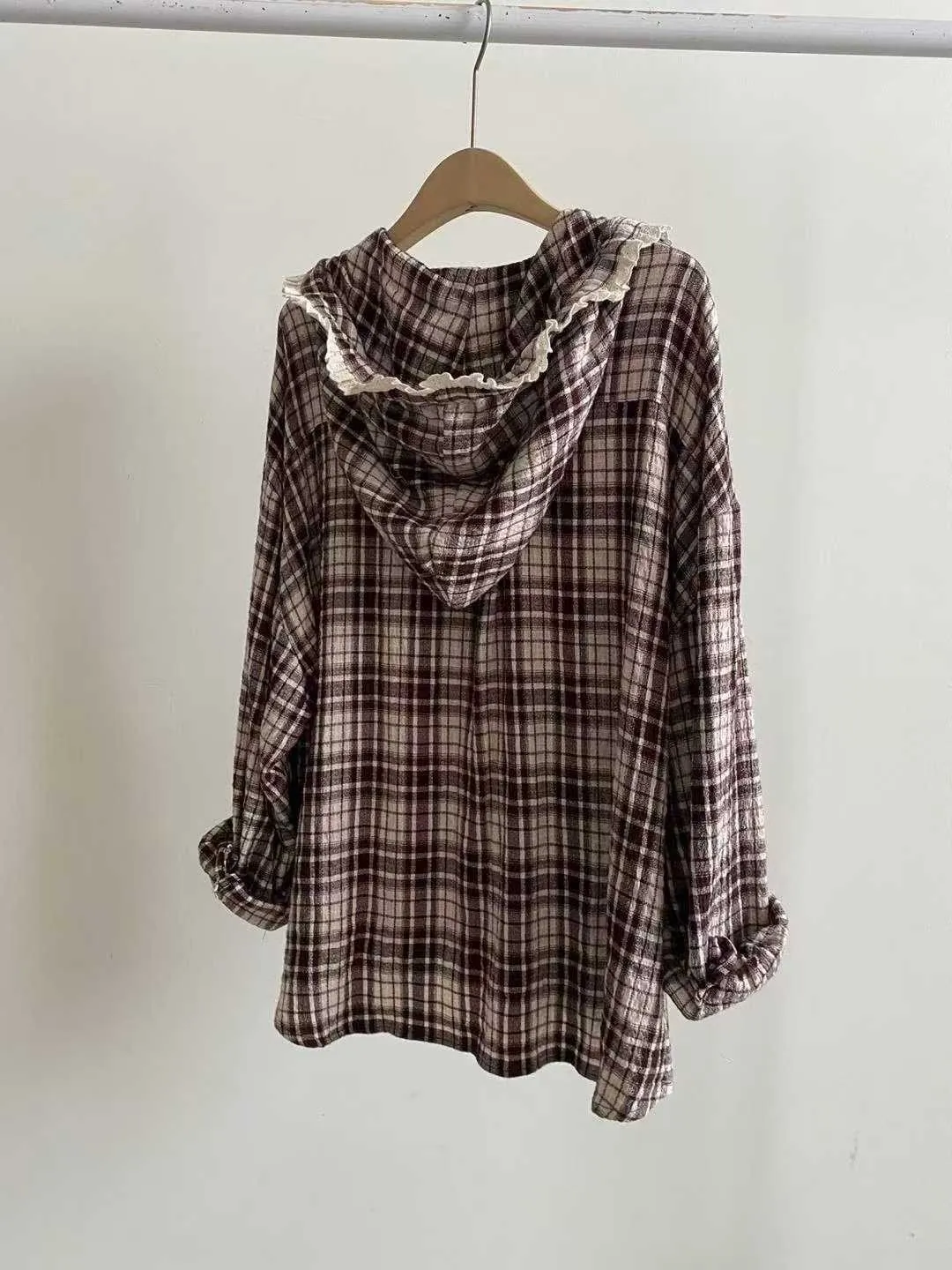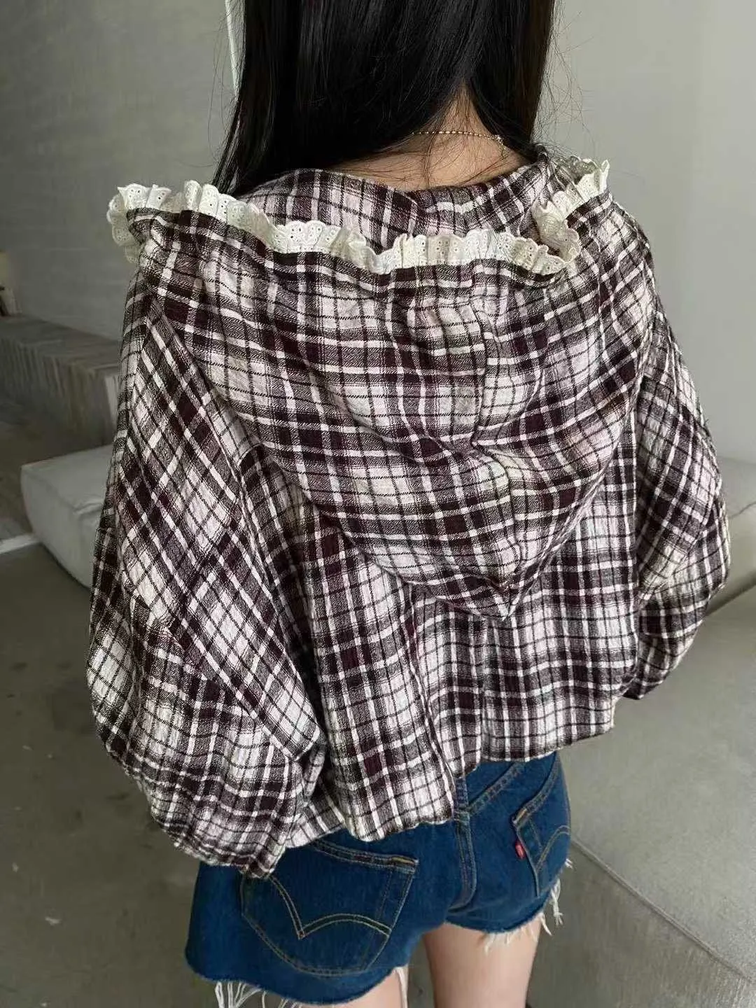 5-9側口袋連帽滾布蕾絲格紋上衣