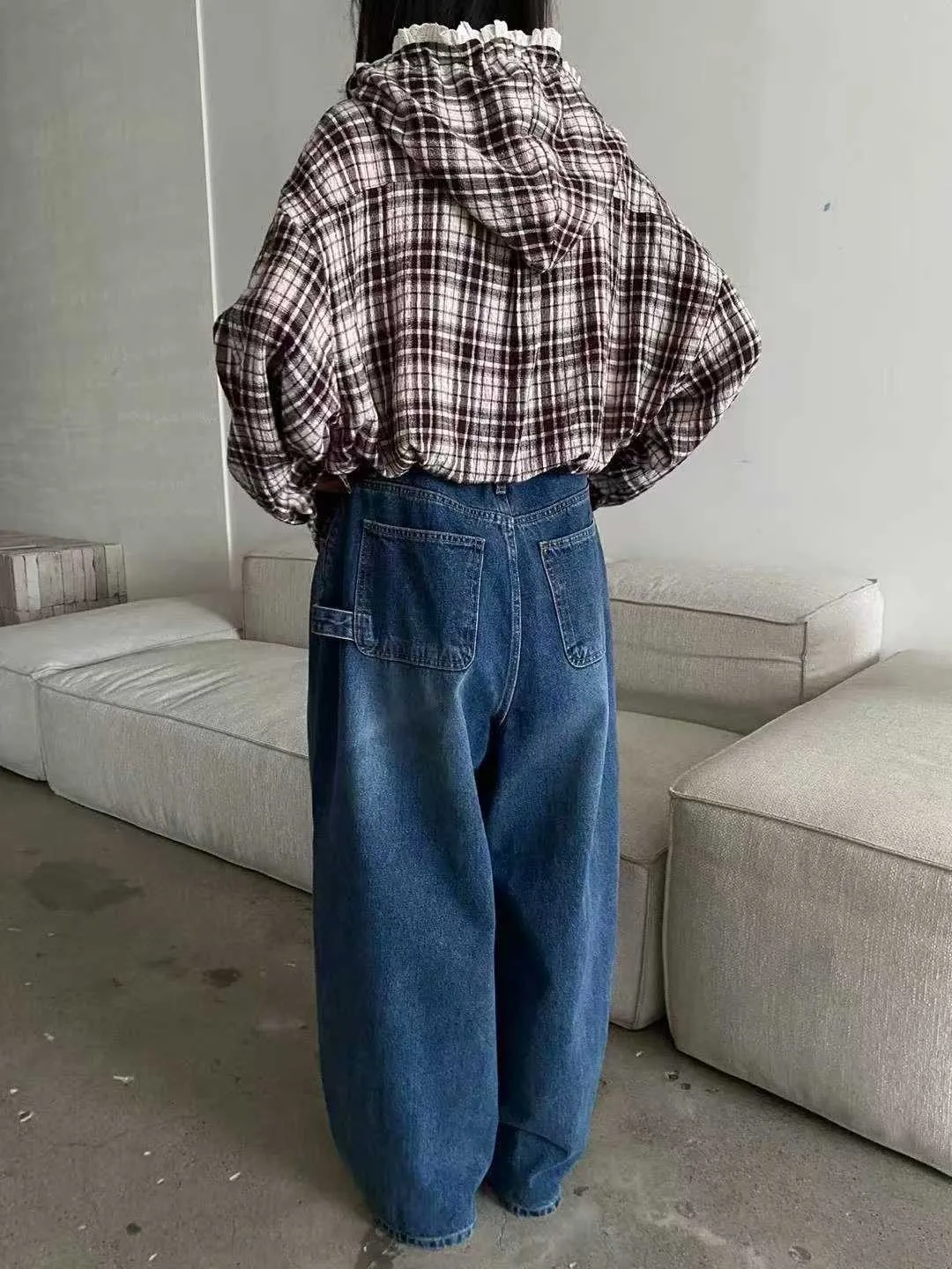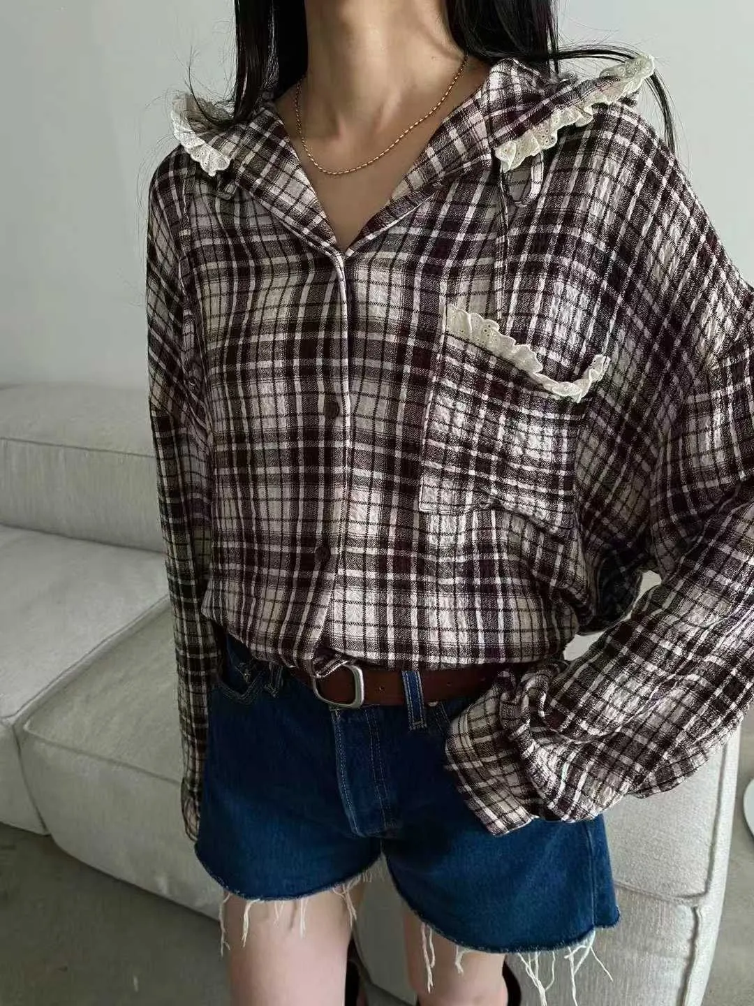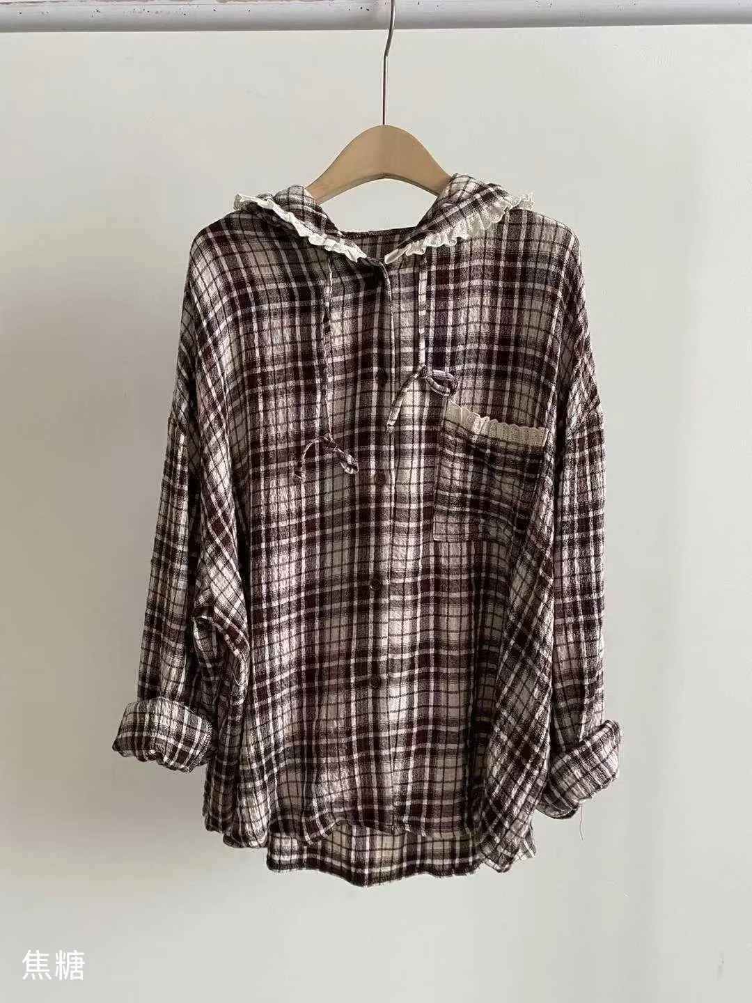 5-9側口袋連帽滾布蕾絲格紋上衣