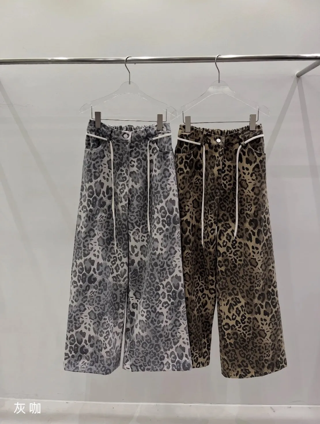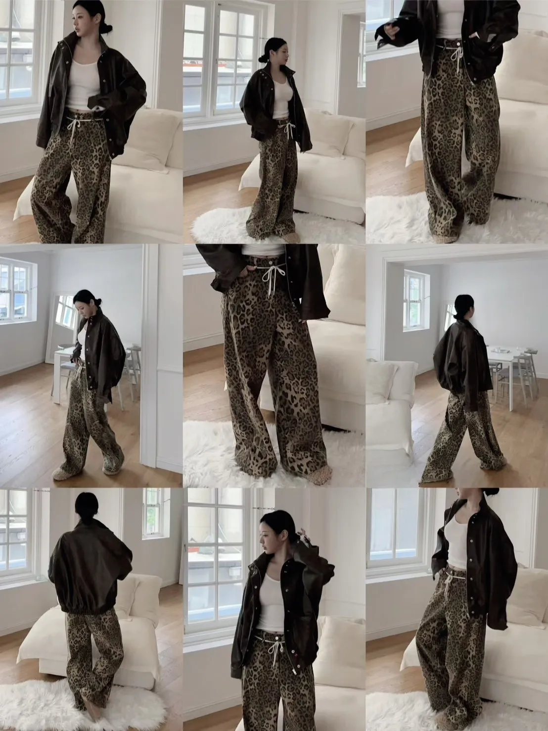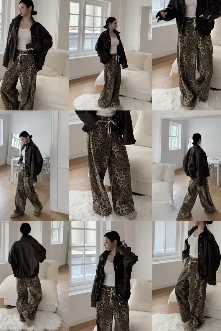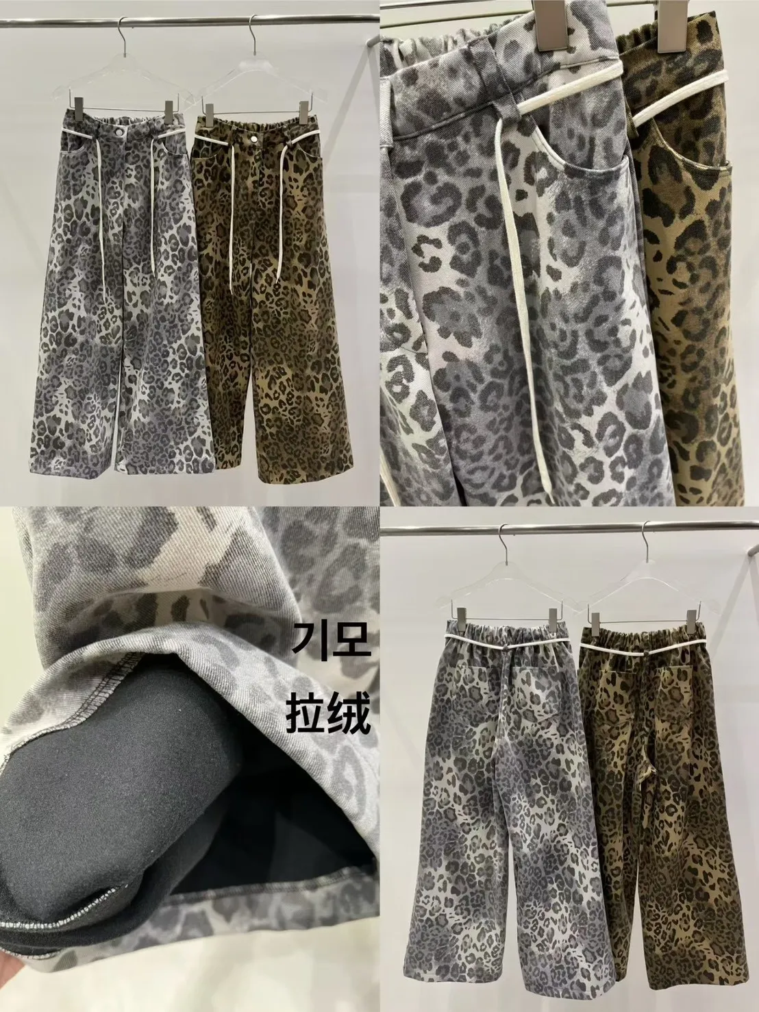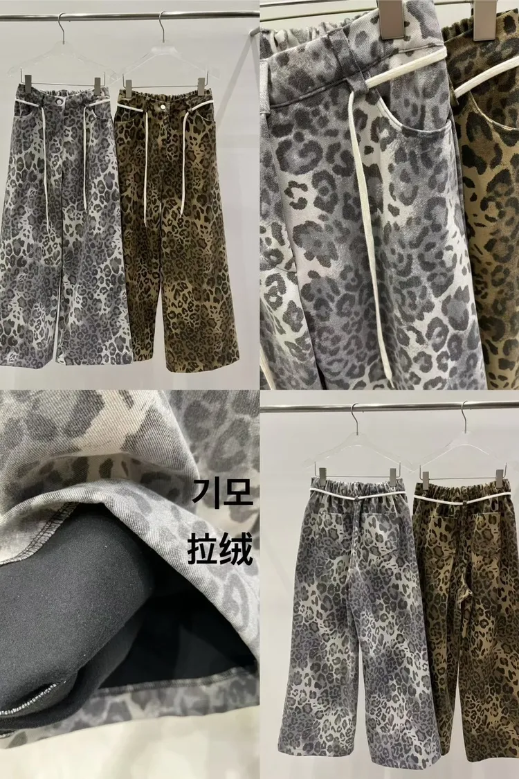 5-10後鬆緊附繩內磨毛豹富豹紋寬褲