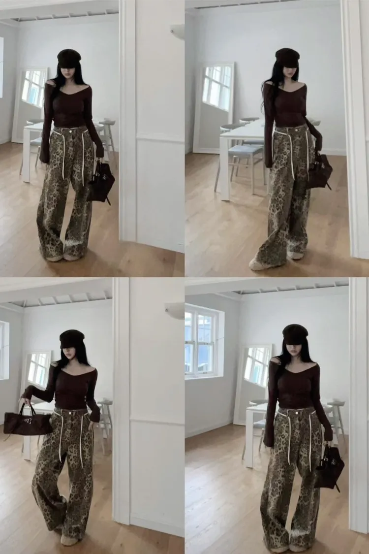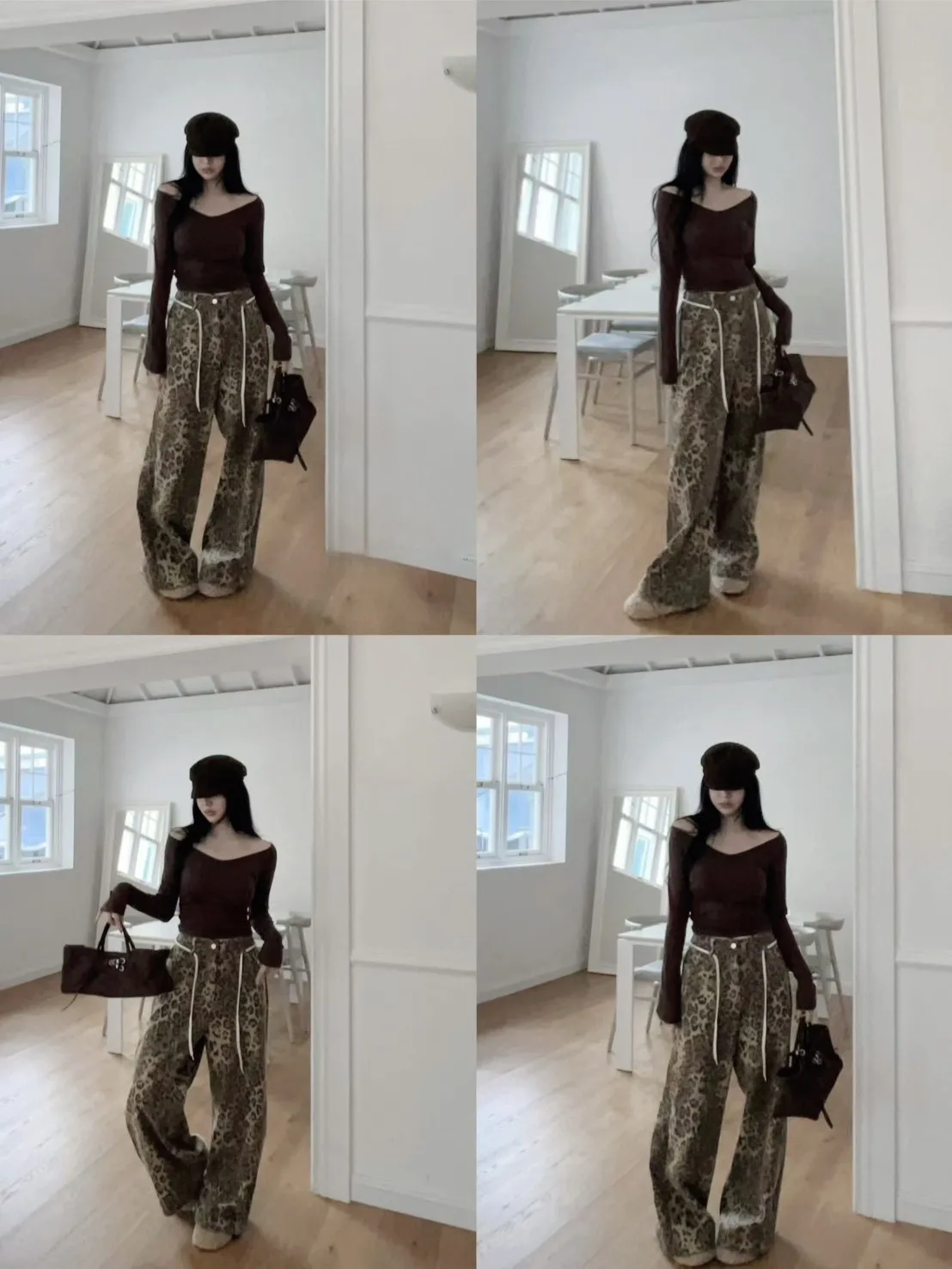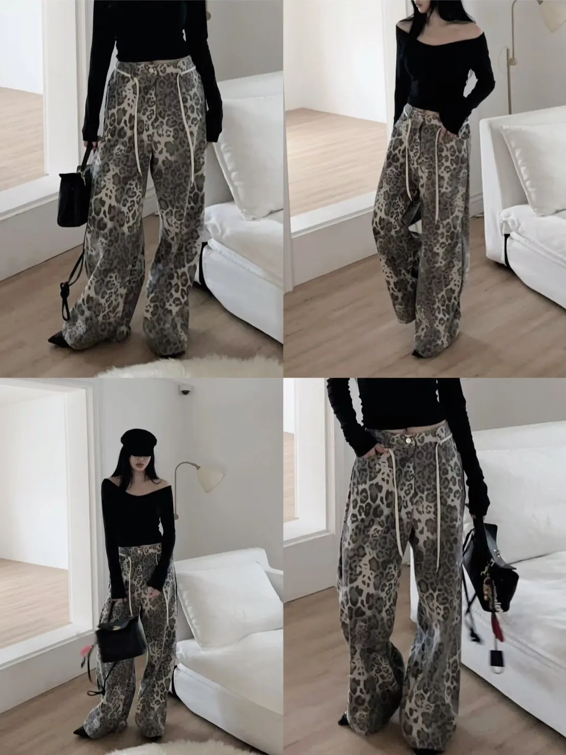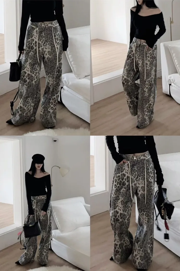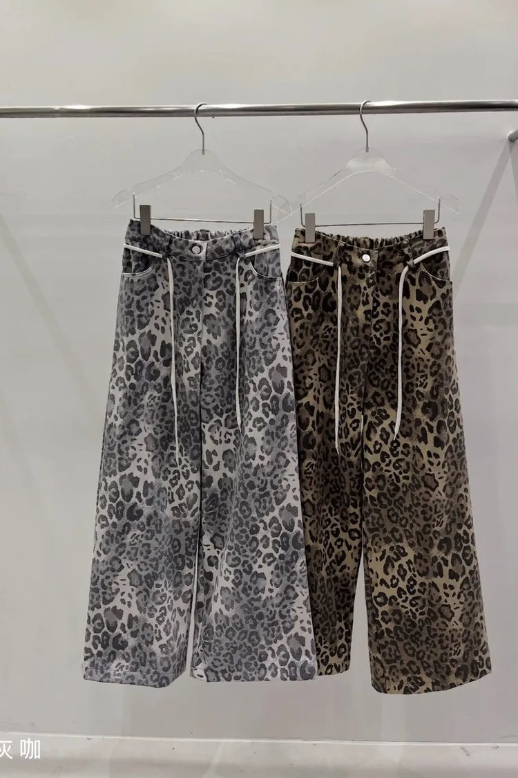5-10後鬆緊附繩內磨毛豹富豹紋寬褲