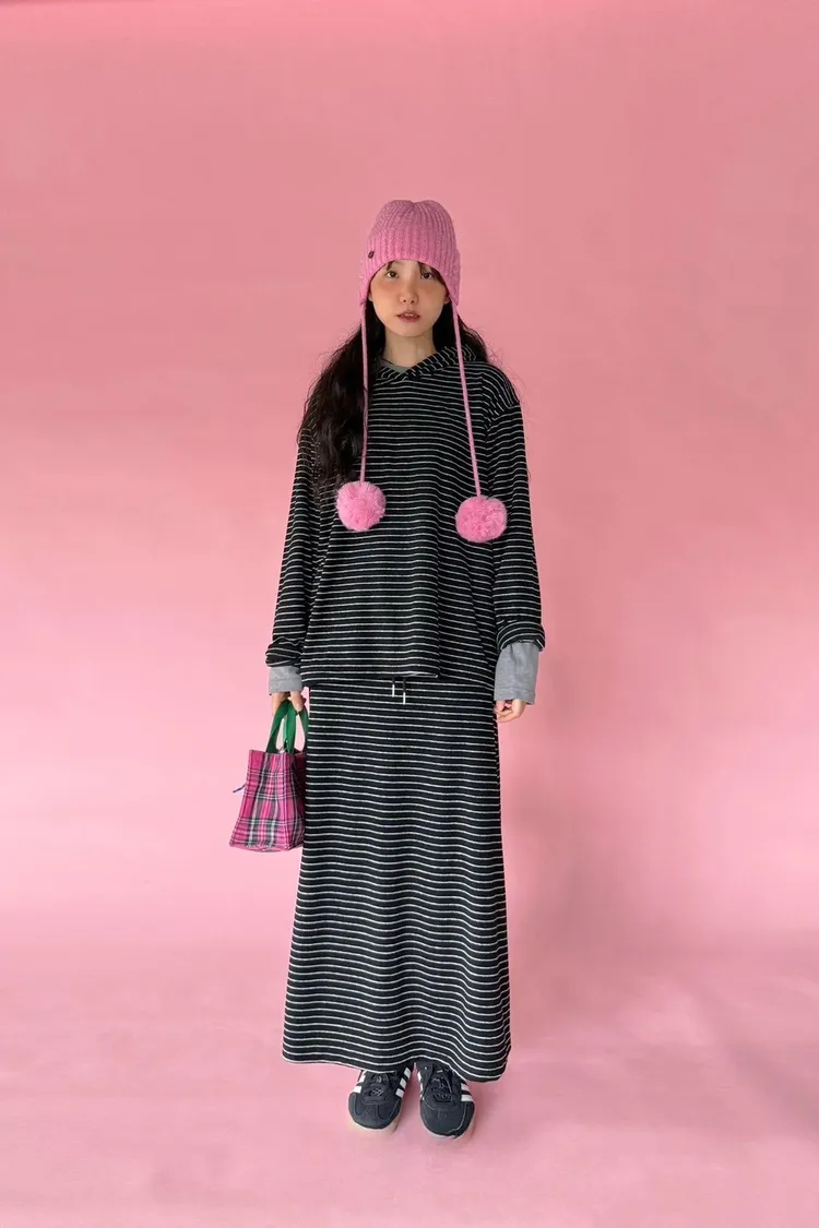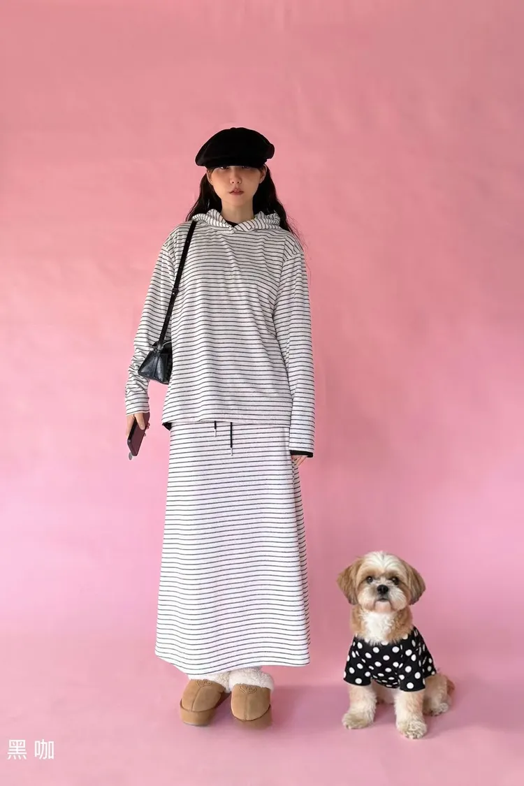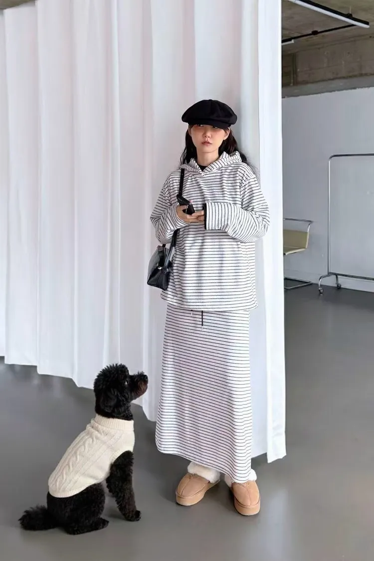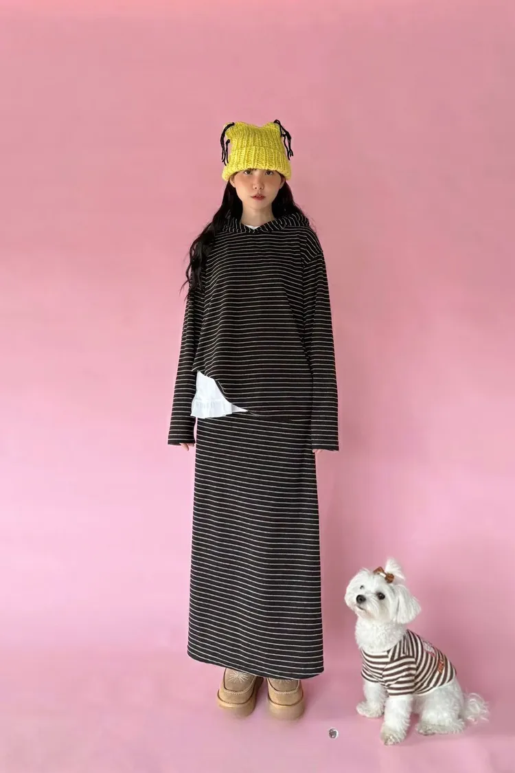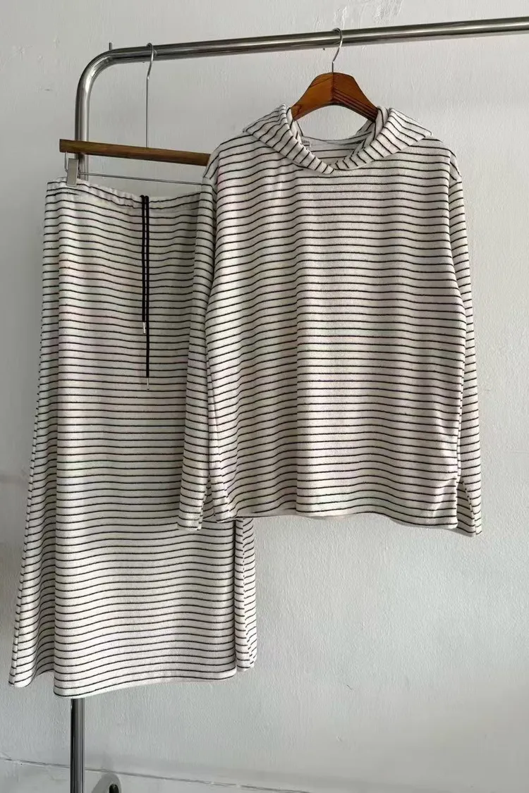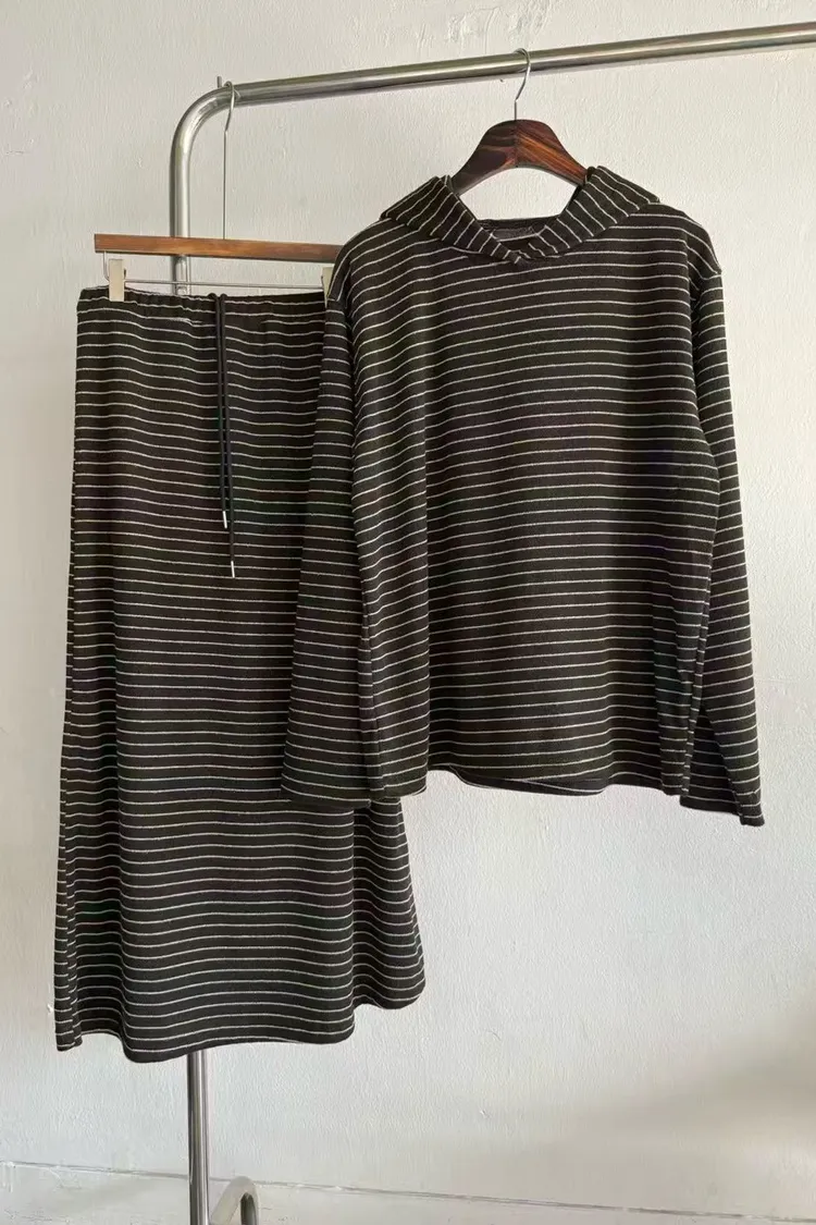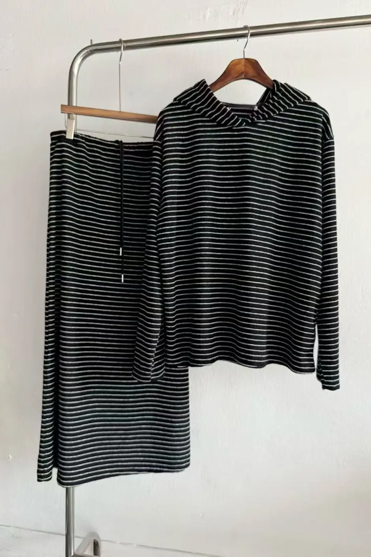5-12細橫條舒服連帽衣+長裙套裝 512081