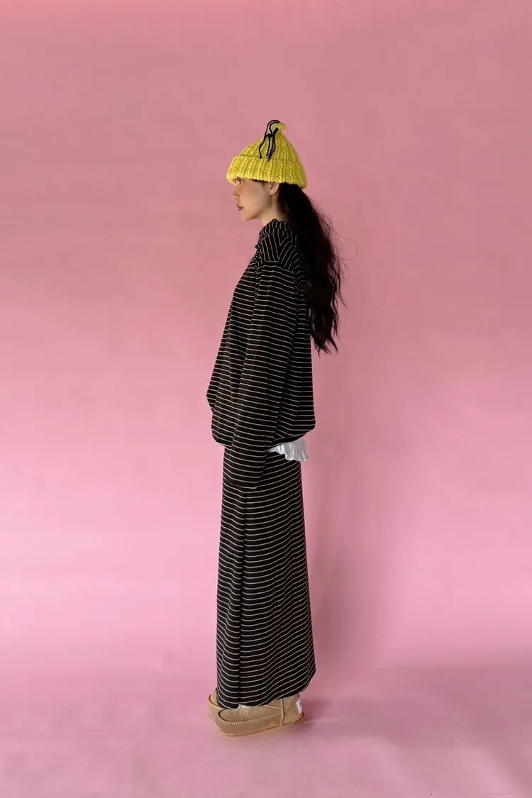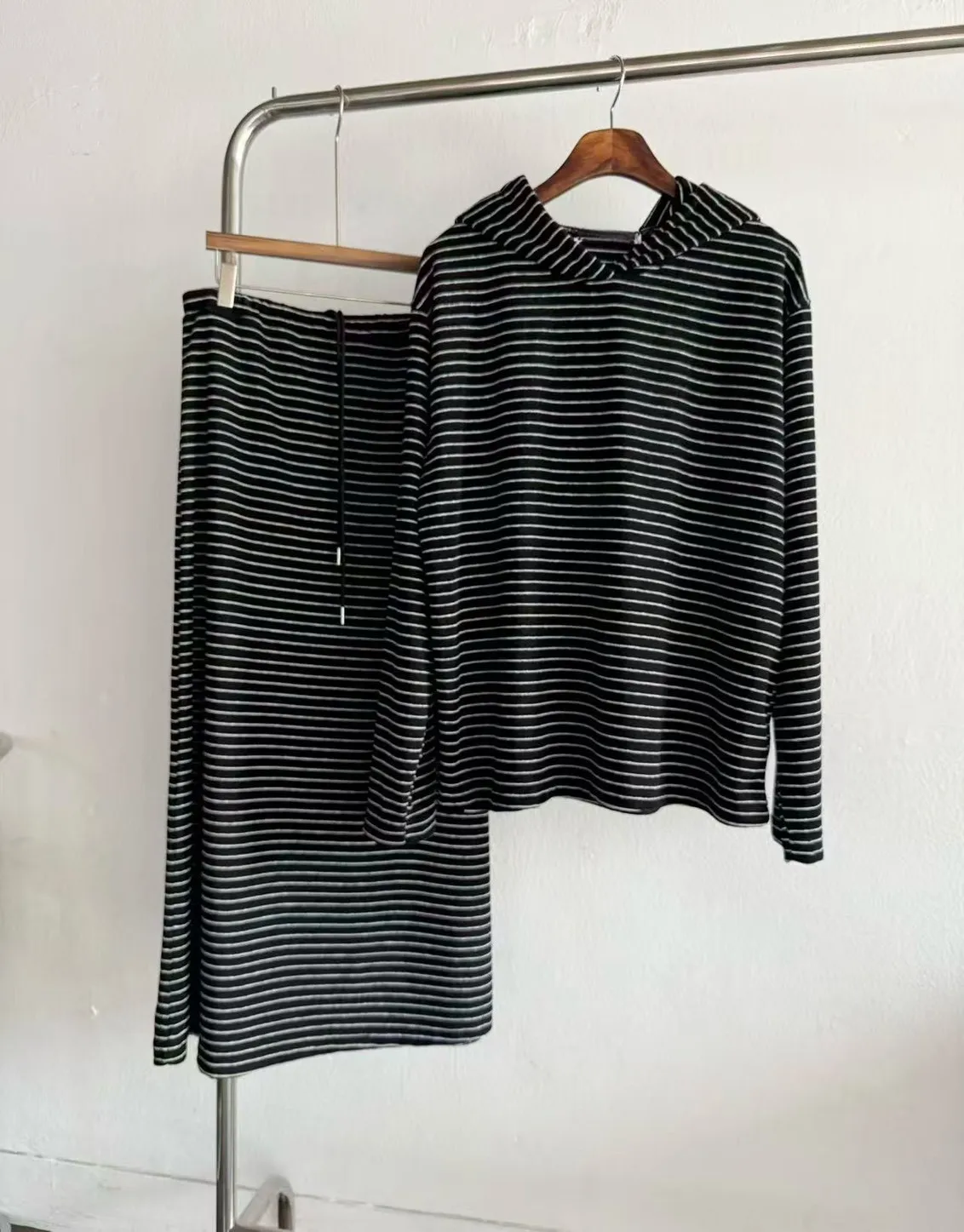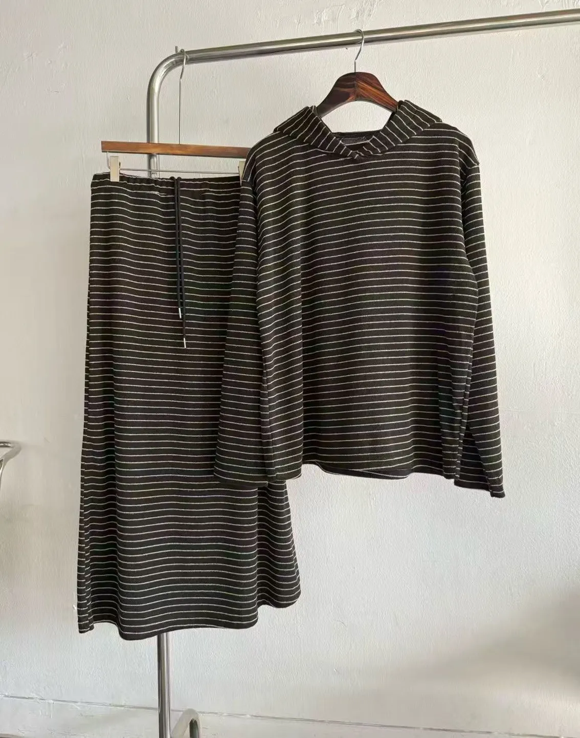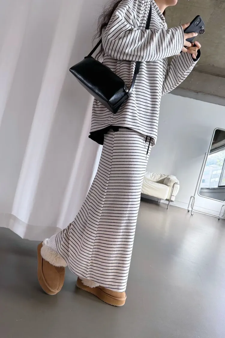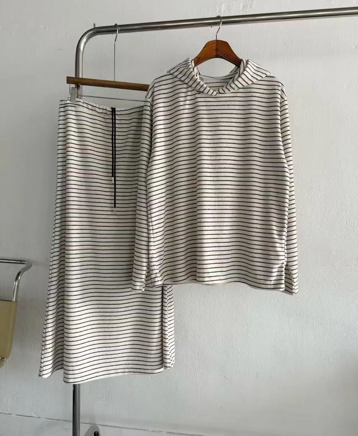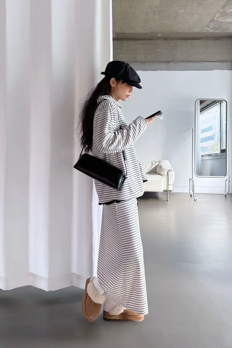 5-12細橫條舒服連帽衣+長裙套裝 512081