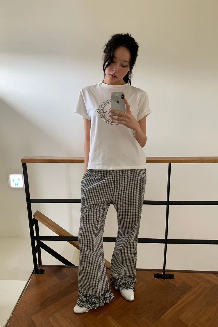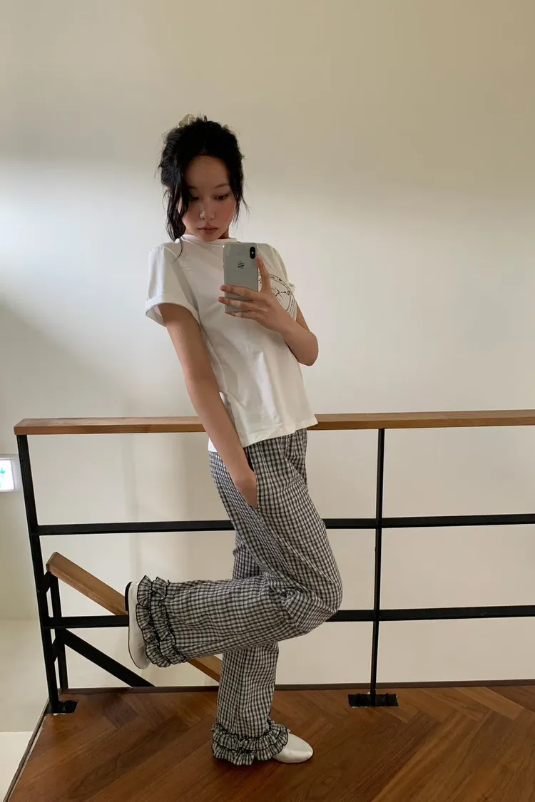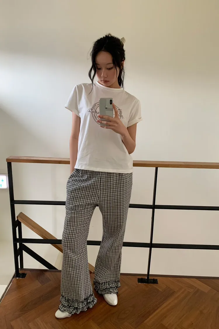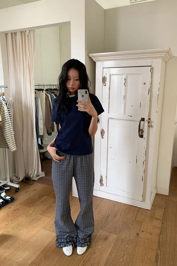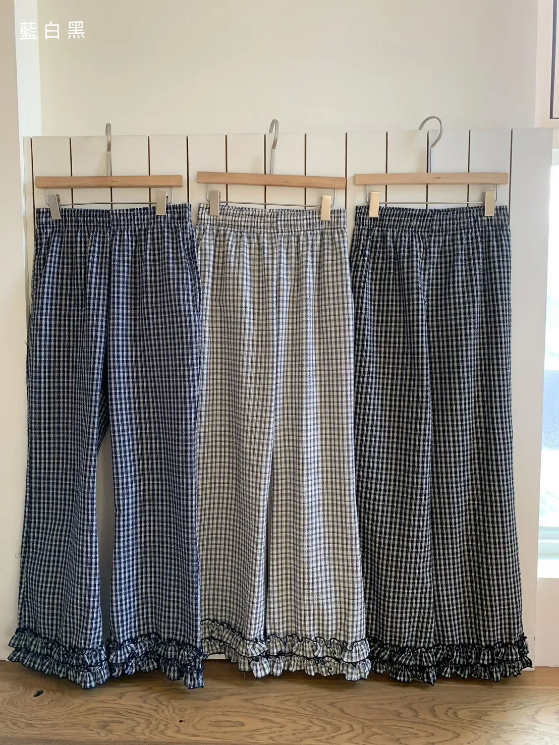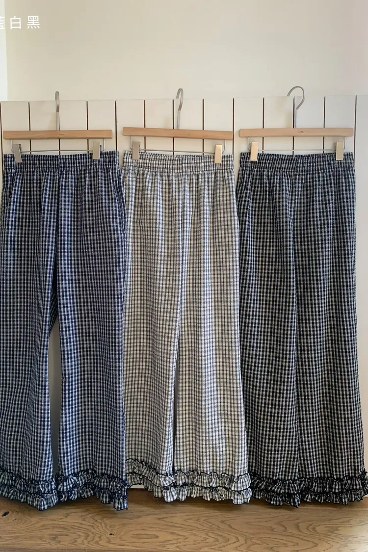 6-3褲管荷葉滾邊泡泡紗小格長褲 603077